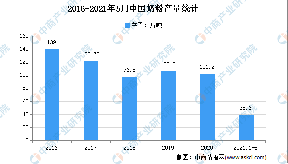 2021年1-5月全国奶粉产量38.58万吨,同比下降9.06%,其中5月份产量7.88万吨,同比下降12.42%。