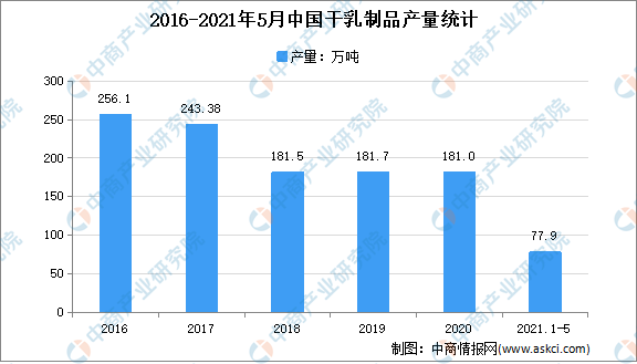 2021年1-5月全国干乳制品产量77.94万吨,同比增长4.94%,其中5月产量16.93万吨,同比下降0.90%。