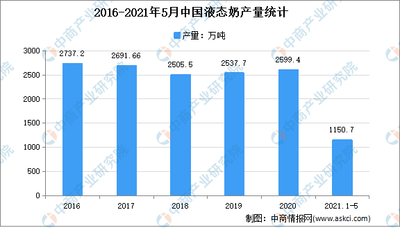 中商情报网讯:数据显示2021年1-5月全国液态奶产量1150.68万吨,同比增长20.96%,其中5月产量249.94万吨,同比增长7.43%。