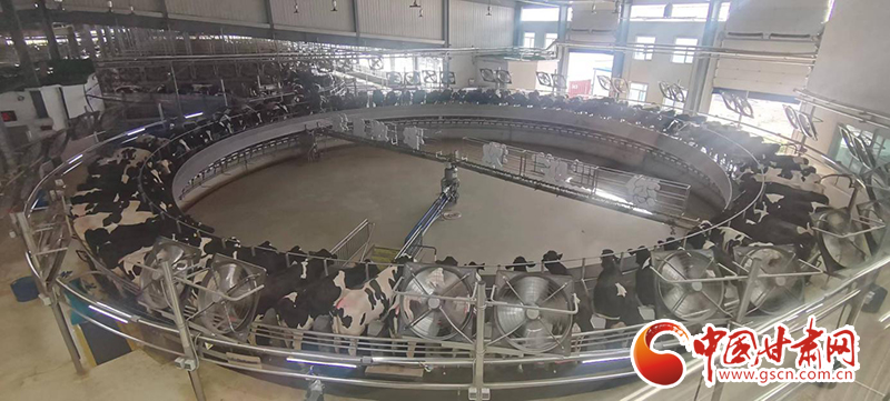 中国兰州网11月24日消息 近日,记者走进甘肃省内单体规模最大的示范性牧场——武威优然牧业12000头奶牛养殖示范园,一头头奶牛在转盘挤奶机上有序挤奶,一排排高标准现代化牛舍整齐排列。