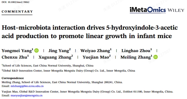 在此背景下,蒙牛与华东师范大学张美玲教授团队,通过非靶向血清代谢组学分析,锁定肠道菌群关键代谢物5-HIAA具有促生长潜力。随后,通过严谨的动物实验证实,摄入Hi188菌株可协同宿主增加5-HIAA的产生,并最终通过提升IGF-1水平发挥促生长作用。