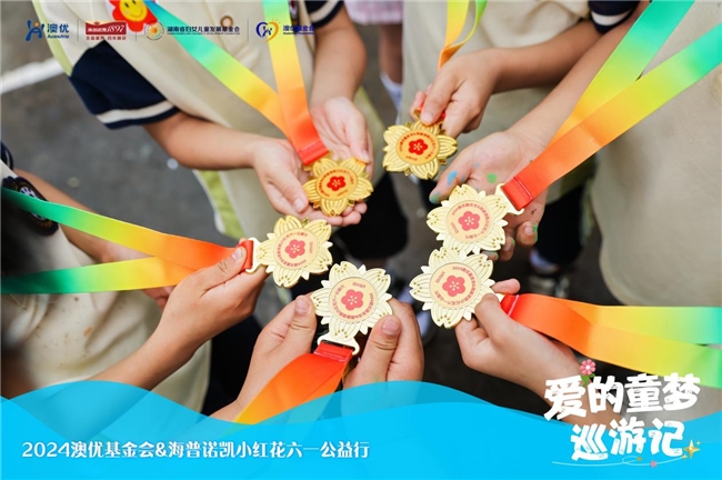 (孩子们手持“2024澳优基金会&海普诺凯小红花六一公益行”纪念章)
