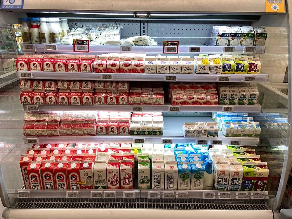 在北京一家超市,低温鲜奶的排面越来越大。君乐宝悦鲜活占据了近一米多宽的风幕柜。在它旁边是三元极致、蒙牛每日鲜语、光明优倍、现代牧场各种品牌的鲜牛奶,而且名目繁多,0脂肪、有机、A2-酪蛋白。