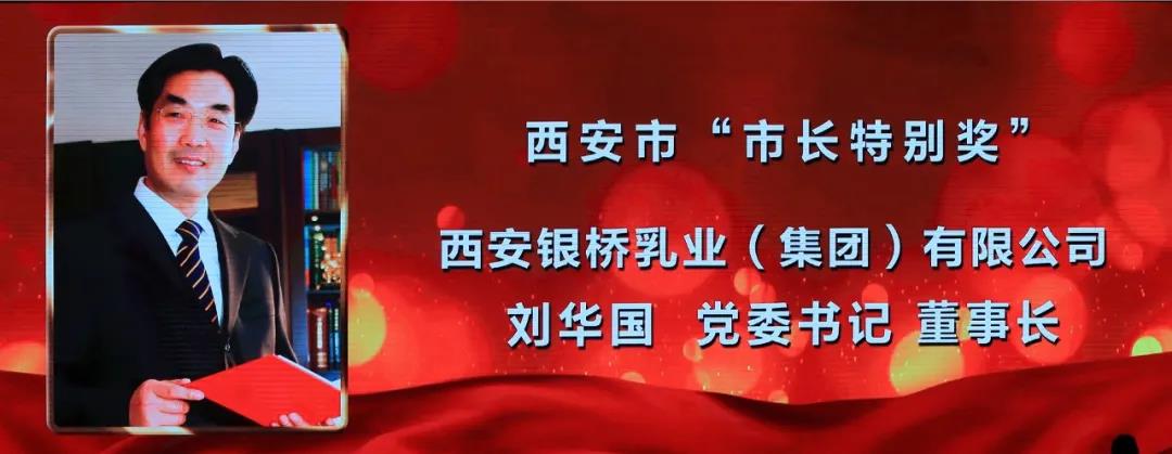 会上对50名企业家和团队进行表彰奖励。西安银桥乳业集团党委书记、董事长刘华国等20名个人(团队)荣获“市长特别奖”表彰。陕西省委常委、西安市委书记王浩与西安市委副书记、市长李明远一同为刘华国董事长颁奖。
