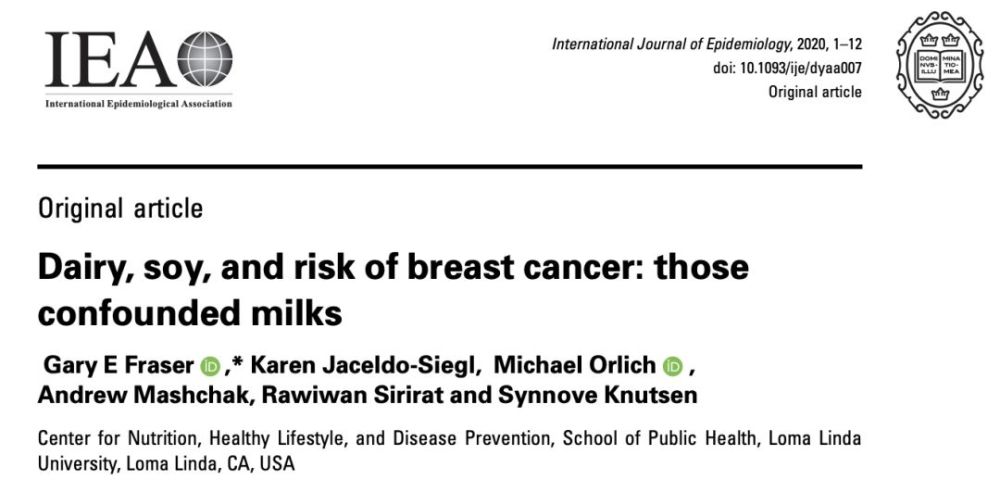 美国洛马琳达大学的研究人员在《国际流行病学杂志》发表了题为:Dairy, soy, and risk of breast cancer: those confounded milks的研究论文,该研究评估了近53000名健康女性,随访了近8年,发现有1057例新发乳腺癌。